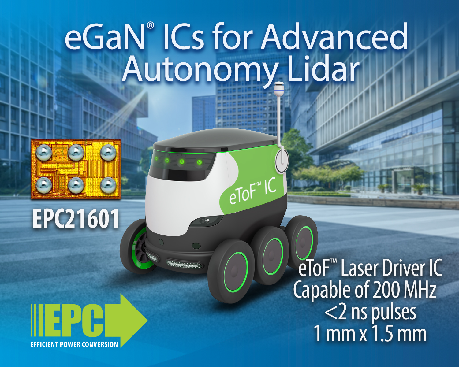 宜普电源转换公司(EPC)近日宣布推出激光驱动器IC(EPC21601),在单个芯片上集成了40 V、10 A 场效应晶体管、栅极驱动器和3.3 V逻辑电平输入,面向飞行时间(ToF)激光雷达系统,用于机器人、监控保安系统、无人机、全自动驾驶汽车和吸尘器。
